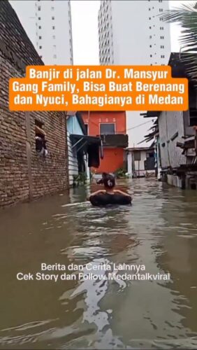 Berita Viral : Banjir di jalan Dr. Mansyur gang Family, bisa buat berenang dan nyuci, bahagianya di Medan.