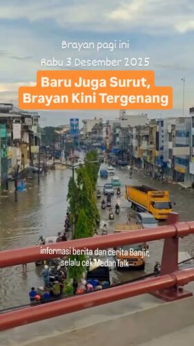 Berita Medan Talk : Brayan pagi ini 03/12/2025 terpantau banjir hingga ke jalan, harap tetap berhati – hati dan selalu waspada.