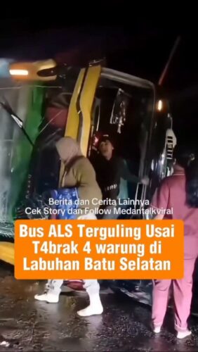 Video Viral : Bus ALS Tergul1ng usai t*brak 4 warung di Desa Sabungan Kecamatan Sungai Kanan, Labuhan Batu Selatan, Senin pagi (20/10/25)
