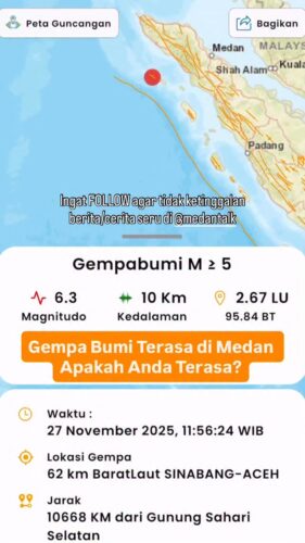 Berikut informasi dari BMKG Info Gempa Mag: 6.3, 27-Nov-25 11:56:24 WIB, Lok:2.67 LU, 95.84 BT (62 km BaratLaut SINABANG-ACEH), Kedlmn:10 Km