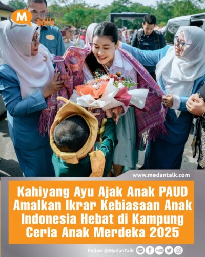 Bunda Pendidikan Anak Usia Dini (PAUD) Sumatera Utara (Sumut) Kahiyang Ayu mengajak anak-anak untuk mengamalkan Tujuh Ikrar Kebiasaan Anak Indonesia Hebat dalam keseharian mereka. Ajakan ini disampaikan dalam kegiatan “Kampung Ceria Anak Merdeka (Kacamer) 2025” yang digagas Ikatan Guru Taman Kanak-Kanak Indonesia (IGTKI) Sumut di Taman Cadika, Medan, Sabtu (1/11/2025).