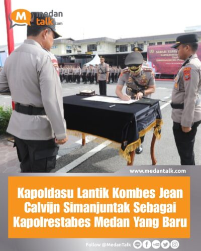 Kapoldasu Irjen Pol Whisnu Hermawan Februanto melantik Kombes Pol Jean Calvijn Simanjuntak sebagai Kapolrestabes Medan yang baru menggantikan Brigjen Pol Gidion Arif Setyawan lewat acara serahterima jabatan di Lapangan Upacara Polrestabes Medan, Kamis (9/10) sekira pukul 09:00.