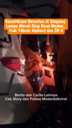 Terjadi kecel4kaan beruntun di simpang lampu merah Ring Road arah Simpang Pos Padang Bulan, Medan. Sebuah truk dilaporkan men4brak dua mobil yang berada di depannya, yakni Toyota Alphard dan Honda CR-V.