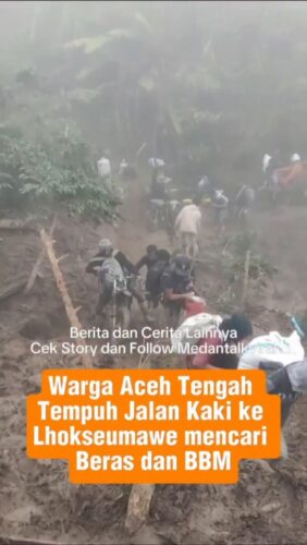 Video Viral : Masyarakat Aceh Tengah menempuh perjalanan kaki menuju Kota Lhokseumawe untuk mencari beras karena masih terisolir akibat akses jalan nasional putus pascabencana banjir bandang dan tanah longsor.