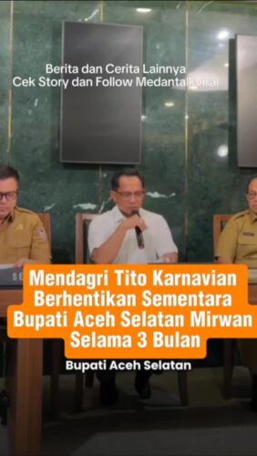 “Pemberhentian sementara selama 3 bulan kepada saudara Mirwan MS sebagai Bupati Aceh Selatan hasil pemilihan pilkada serentak untuk masa jabatan 2025-2030,” ujar Tito di Kantor Kemendgari, Jakarta, Selasa (9/12).
