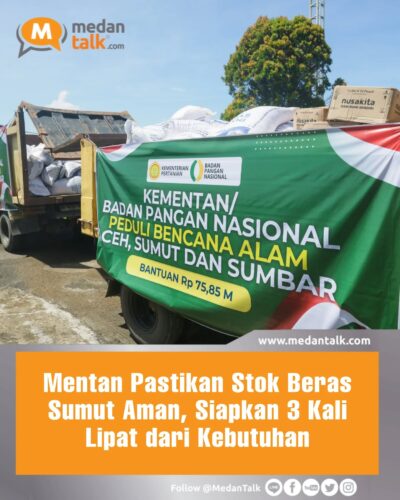 Menteri Pertanian (Mentan) Andi Amran Sulaiman memastikan stok beras di Sumatera Utara (Sumut), Aceh dan Sumatera Barat aman. Dia menyiapkan stok 3 kali lebih banyak dari kebutuhan normal untuk ketiga provinsi yang menagalami bencana longsor dan banjir akhir bulan lalu.