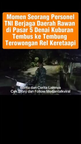 Berita Viral : Momen seorang personel TNI berjaga di daerah rawan di kawasan Pasar 5 Denai, tepatnya di terowongan rel kereta 4pi menuju Tembung, Medan, Jumat (7/11/2025) pukul 04.00 WIB.