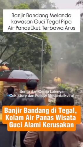 “Curah hujan dengan intensitas tinggi menyebabkan aliran sungai meluap dan menerjang kawasan Wisata Guci. Lokasi Kejadian (di) Objek Wisata Air Panas Pancuran 13 Guci,” kata Kepala Pelaksana Harian (Kalakhar) BPBD Provinsi Jawa Tengah, Bergas Catursasi Penanggungan dilansir detikJateng, Sabtu (20/12/2025).