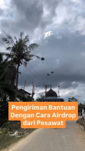 Berita Medan Talk : penyaluran bantuan dengan cara airdrop dari pesawat dengan menggunakan parasut, kepada warga di payabedi kualasimpang aceh tamiang, Masyarakat menyambut dengan gembira bantuan tersebut.