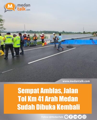 Jalan Tol pada kilometer (Km) 41 dari arah Kota Medan kembali dibuka setelah sebelumnya mengalami amblas akibat tingginya curah hujan. Ruas jalan tersebut kini sudah kembali beroperasi secara normal.