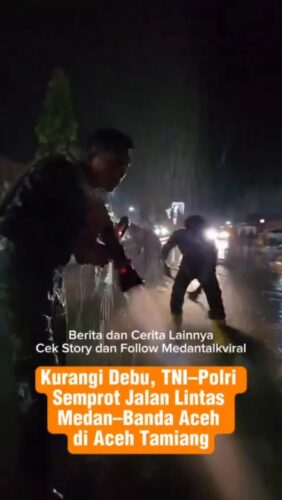 Upaya bersama dilakukan TNI dan Polri dengan membersihkan serta menyemprot jalan lintas Medan–Banda Aceh di Aceh Tamiang.