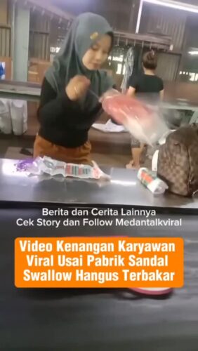 Sebuah video yang dibagikan seorang karyawan pabrik sandal Swallow viral di media sosial usai kebakaran hebat melanda pabrik tersebut di Jalan Yos Sudarso, Kelurahan Tanjung Mulia, Kecamatan Medan Deli.